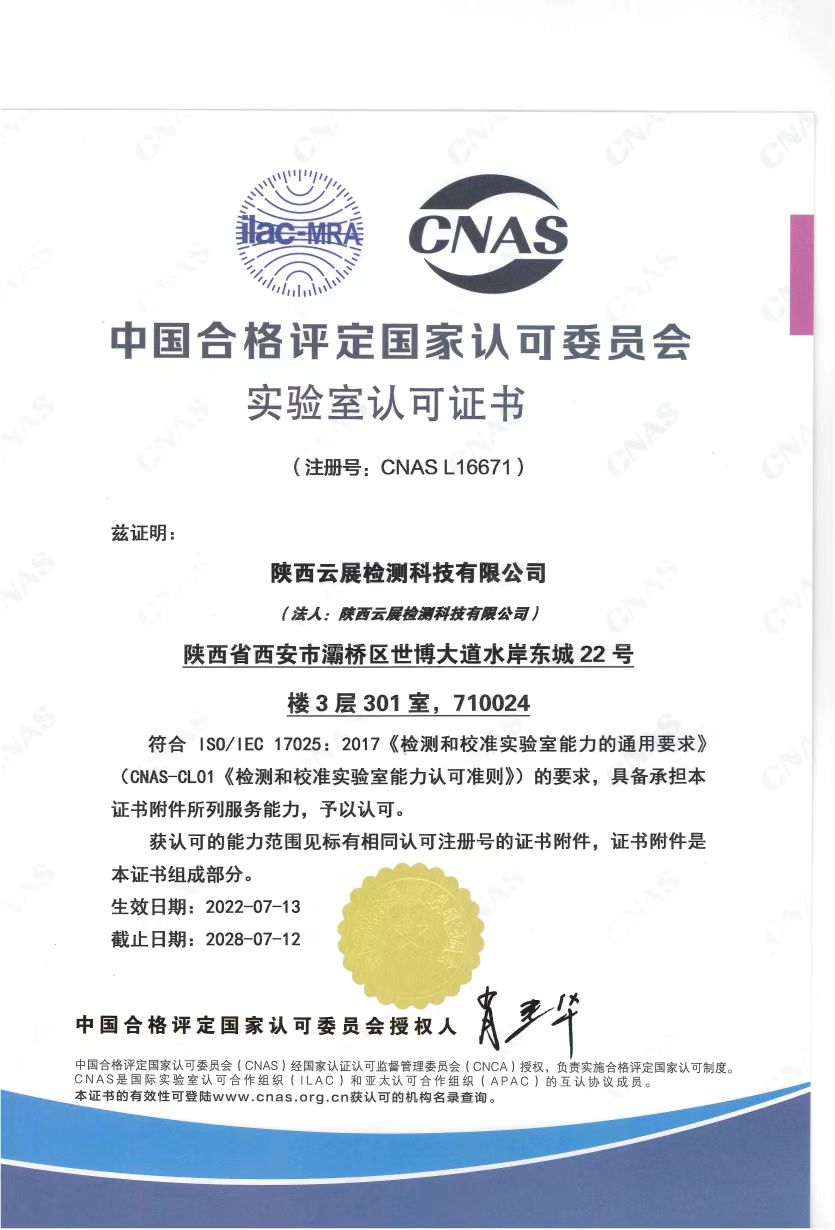 2022年7月18日, 我公司实验室成功通过了中国合格评定国家认可委员会(下称CNAS)的审核,并获得实验室认可证书,CNAS注册号为L16671.这标志着我公司可在认可范围内使用CNAS国家实验室认可标志,有利于提高企业核心竞争力。